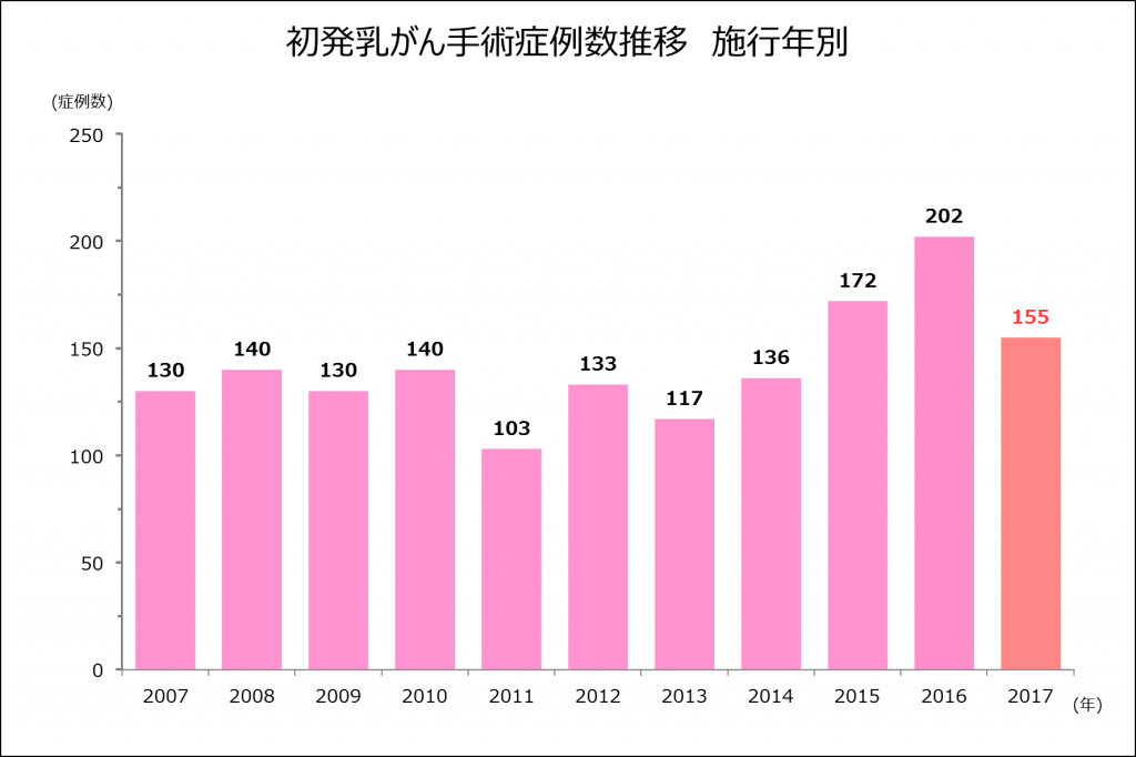 当院で行った初発の乳がんに対する初回の手術を集計したグラフです。