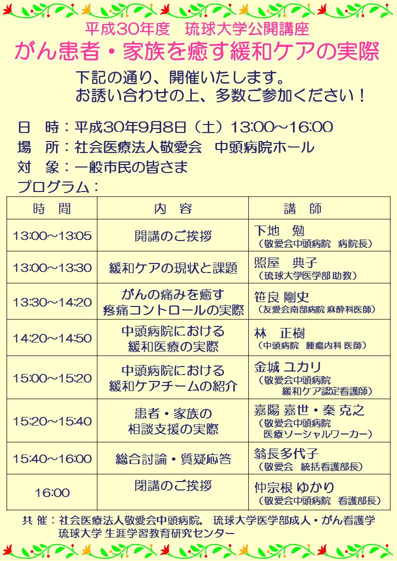 平成30年度 琉球大学公開講座「がん患者・家族を癒す緩和ケアの実際」